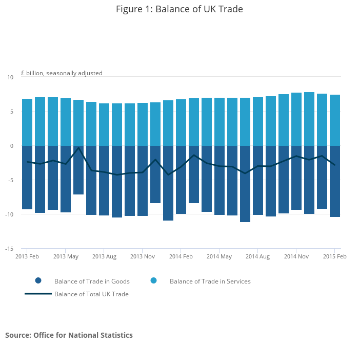 Seasonally adjusted, the UK’s deficit on trade in goods and services was estimated to have been £2.9 billion in February 2015, compared with £1.5 billion in January 2015. This reflects a deficit of £10.3 billion on goods, partially offset by an estimated surplus of £7.5 billion on services