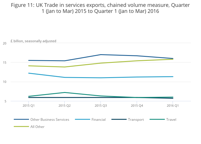 Between Quarter 4 (October to December) 2015 and Quarter 1 (January to March) 2016, exports of services decreased by £0.3 billion to £54.8 billion; the main contributor to this decrease was other business services (£0.8 billion). This decrease was offset by increases in other services (£0.4 billion) and travel services (£0.1 billion). For the same period, the import of services decreased by £0.5 billion to £34.7 billion; the main contributors to this decrease were travel services (£1.6 billion) and all other services (£0.4 billion), offset by an increase in other business services (£1.5 billion).