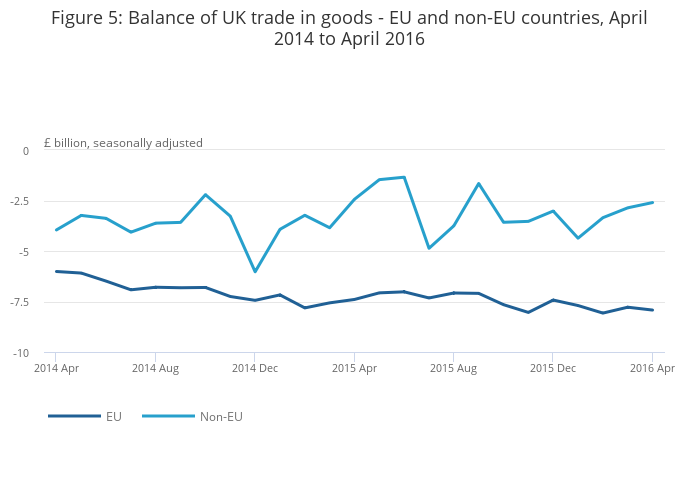 In the 3 months to April 2016, the UK’s trade in goods deficit with the EU widened by £0.6 billion, to a record 3 monthly deficit of £23.8 billion. In the 3 months to April 2016, exports of goods to the EU increased by £2.1 billion and imports of goods from the EU increased by £2.7 billion, to a record 3 monthly level of £58.6 billion.