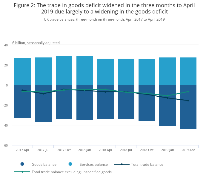 The total trade deficit (goods and services) widened £2.7 billion to £15.6 billion in the three months to April 2019, as the trade in goods deficit widened £2.8 billion to £43.4 billion and the trade in services surplus widened £0.1 billion to £27.9 billion.