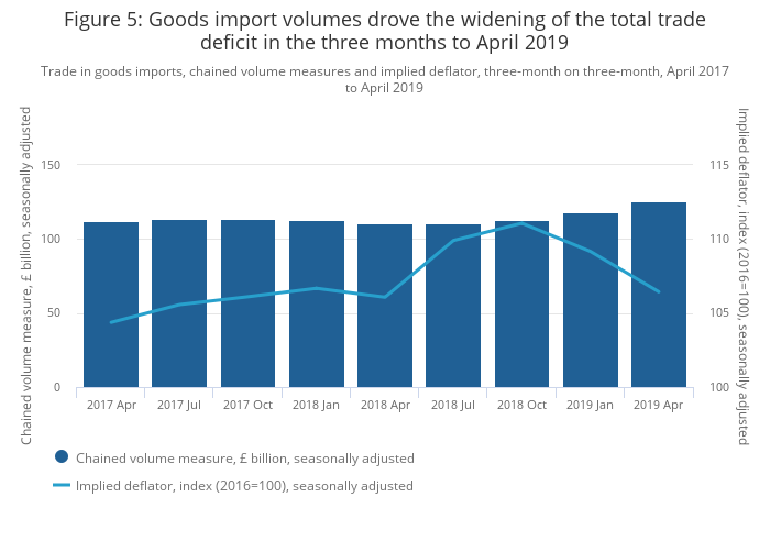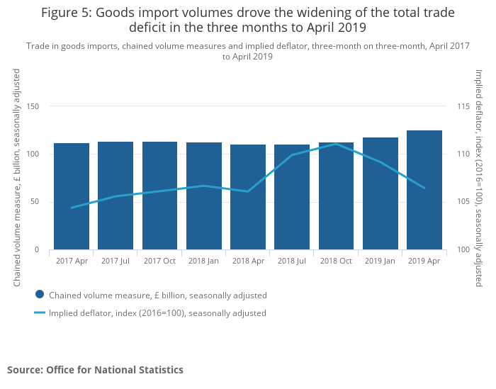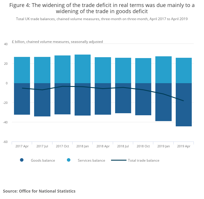In volume terms, the total trade deficit (goods and services) widened £7.0 billion to £18.4 billion in the three months to April 2019, as the trade in goods deficit widened £5.6 billion to £44.3 billion and the trade in services surplus narrowed by a lesser £1.4 billion to £25.9 billion.