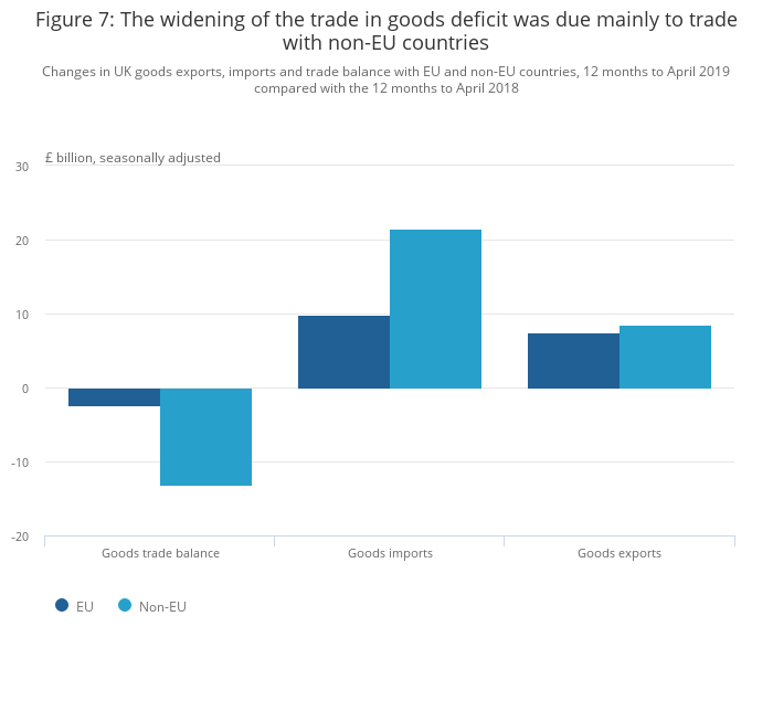 - The trade in goods deficit widened with both EU and non-EU countries in the 12 months to April 2019