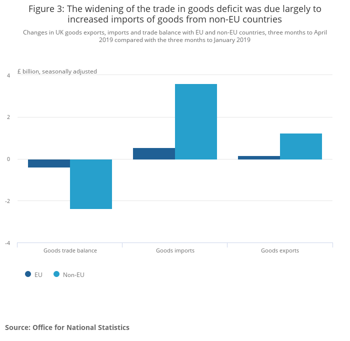The trade in goods deficit widened £2.4 billion to £18.4 billion with non-EU countries and £0.4 billion to £25.0 billion with EU countries in the three months to April 2019.