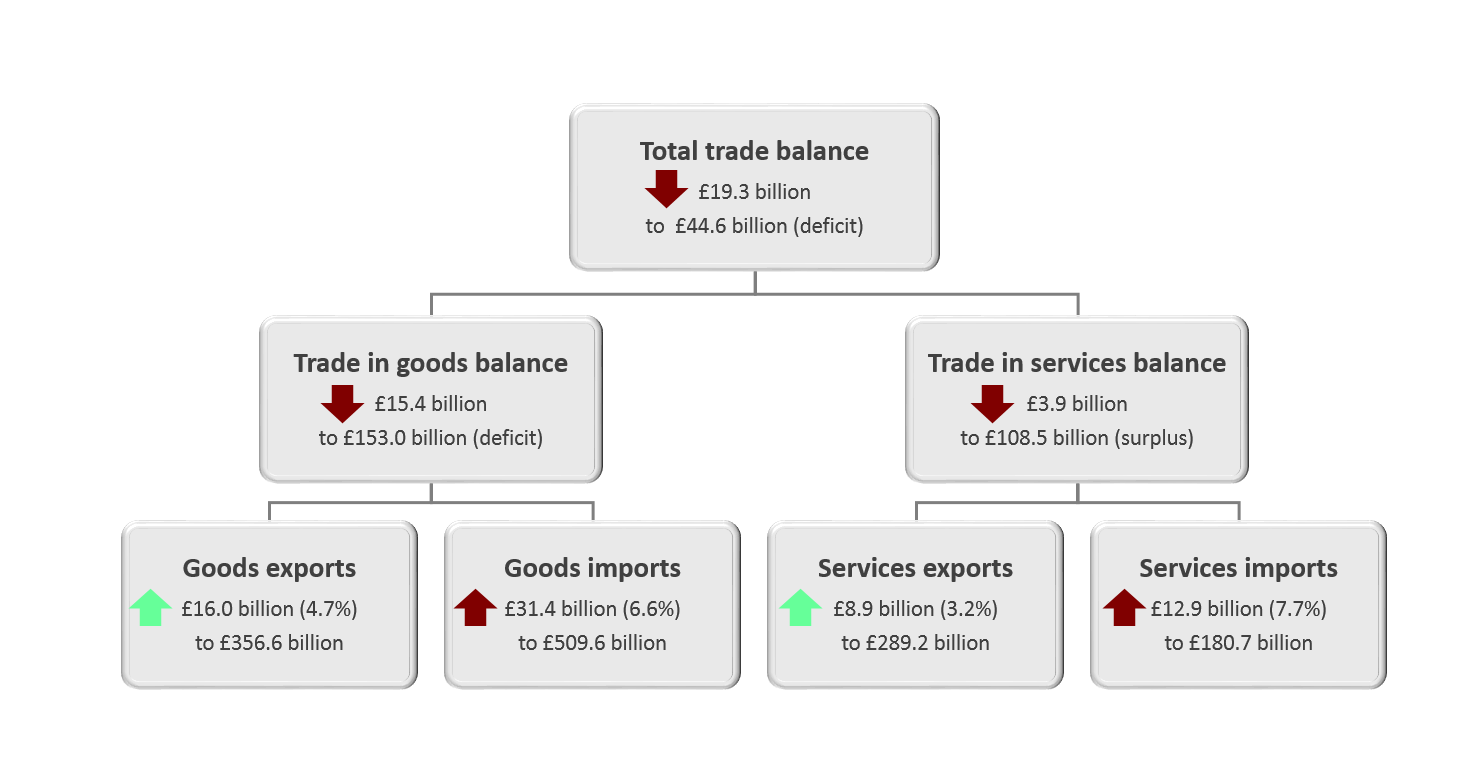 | Total trade | Increased £24.9 billion (4.0%) to £645.8 billion | Increased £44.2 billion (6.8%) to £690.4 billion | Decreased £19.3 billion to £44.6 billion (deficit) |