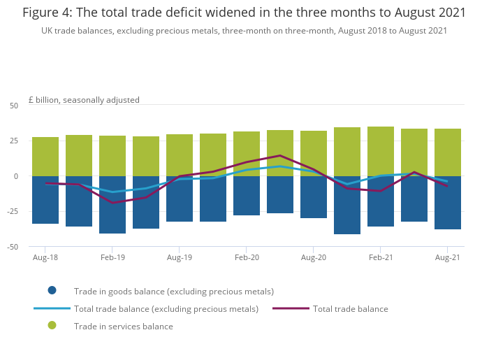 The total trade balance, excluding precious metals, decreased by £5.5 billion to a deficit of £4.2 billion in the three months to August 2021, driven by a decrease in the trade in goods balance, excluding precious metals.