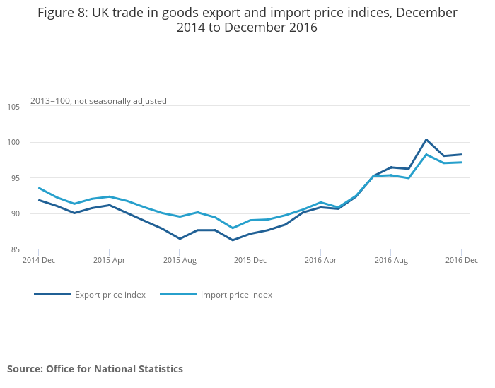 However, the value of sterling increased in November and December of 2016, and was 2.1% higher in December 2016 compared with the November 2016 average, but remains 14.5% lower when compared with December 2015. Comparing November 2016 and December 2016, export prices increased slightly by 0.2% and import prices increased by 0.1%.