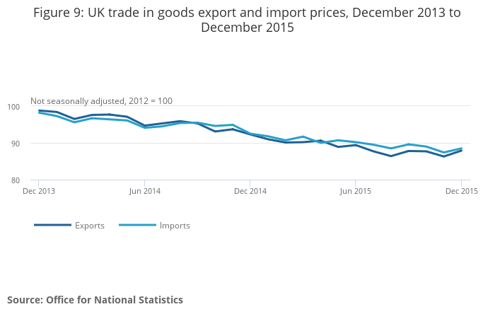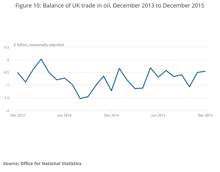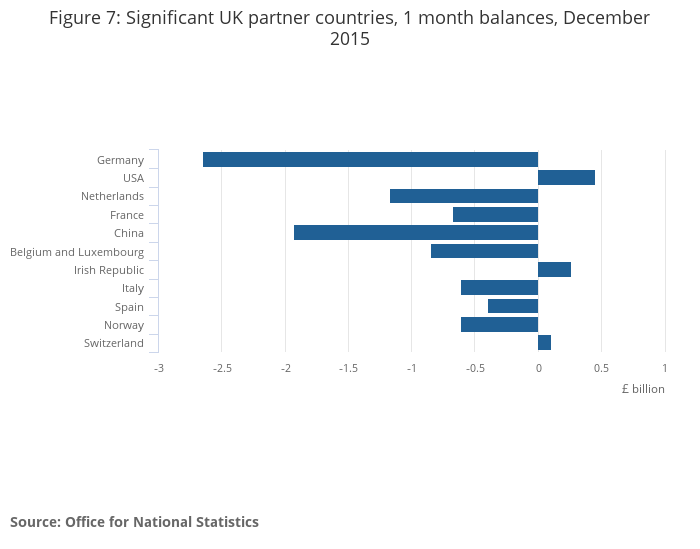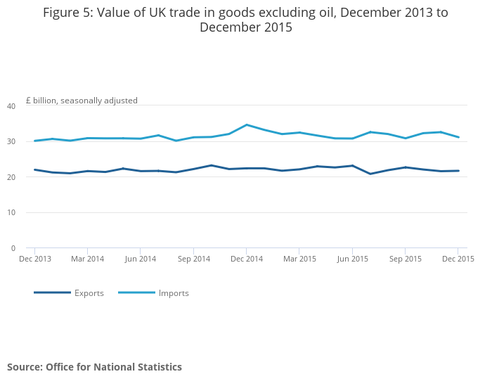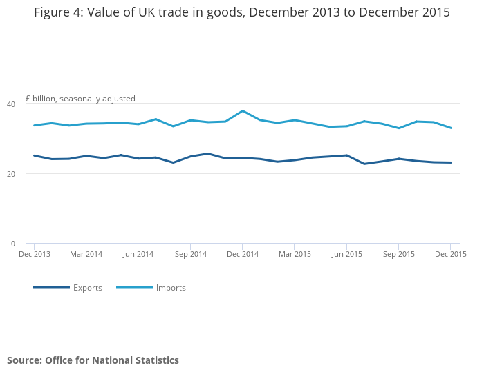 The UK’s deficit on trade in goods and services was estimated to have been £2.7 billion in December 2015, a narrowing of £1.3 billion from November 2015. The narrowing is attributed to trade in goods where the deficit has narrowed from £11.5 billion in November 2015, to £9.9 billion in December 2015.