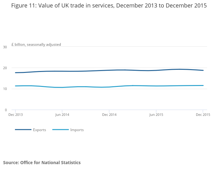 In 2015 there was a record surplus on trade in services of £90.3 billion. Between 2014 and 2015 exports of services increased by £7.1 billion (3.2%) to £226.8 billion largely attributed to an increase in financial services. Imports of services in 2015 increased £5.5 billion (4.2%) to £136.5 billion, with increases in travel and financial services.