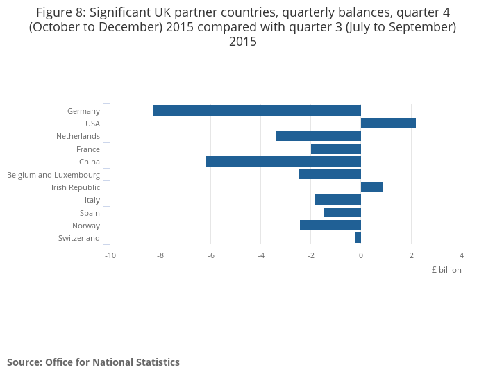In quarter 4 (October to December) 2015, the UK’s deficit on trade in goods and services was estimated to have been £10.4 billion; widening by £1.8 billion from quarter 3 (July to September) 2015.