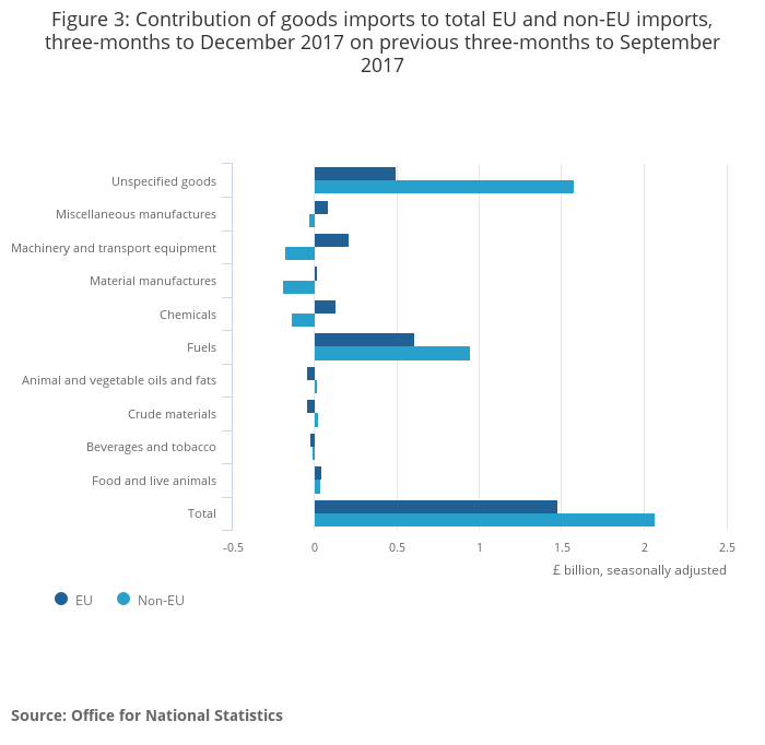 The widening of the trade in goods deficit was due mainly to a 3.8% (£2.1 billion) increase in imports from non-EU countries, alongside decreases in exports to the EU, in the three months to December 2017.