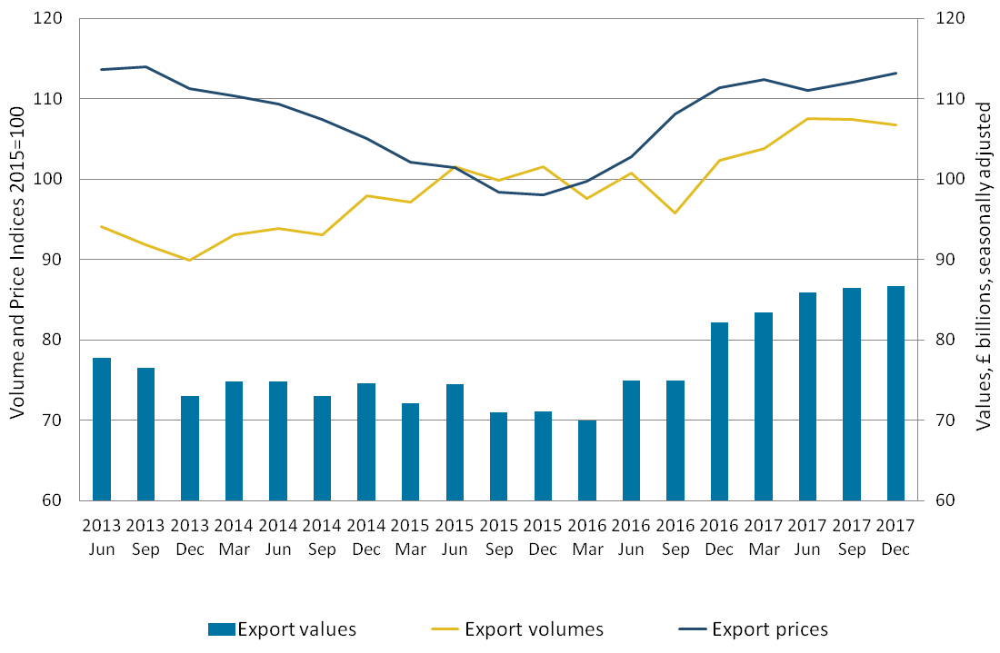 The £0.3 billion increase in the value of total goods exports to £86.7 billion in the three months to December 2017 was due primarily to price increases. Total export prices increased by 1.0% while export volumes fell by 0.6%. The 21.6% decrease in export volumes of fuels (mainly oil) had a large impact on the fall in export volumes. When excluding oil export volumes increased by 1.3%.