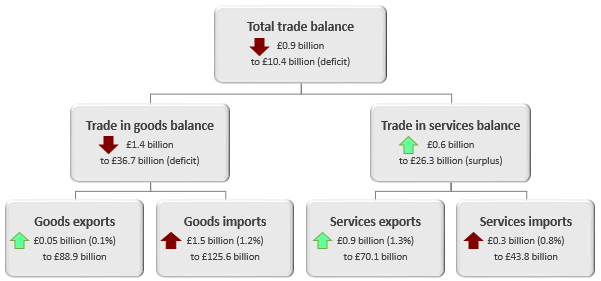 Goods exports fell £0.7 billion, while goods imports rose £1.9 billion in the three months to December 2018; services exports increased £2.1 billion, while imports increased £0.05 billion.
