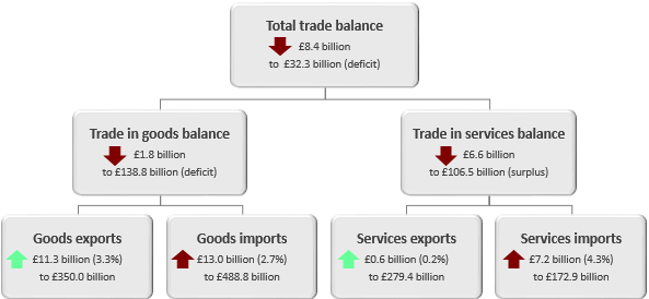 The total UK trade deficit (goods and services) widened £8.4 billion to £32.3 billion in 2018. The widening of the trade deficit was due mainly to a £6.6 billion narrowing in the trade in services surplus; the goods deficit widened by a lesser £1.8 billion.