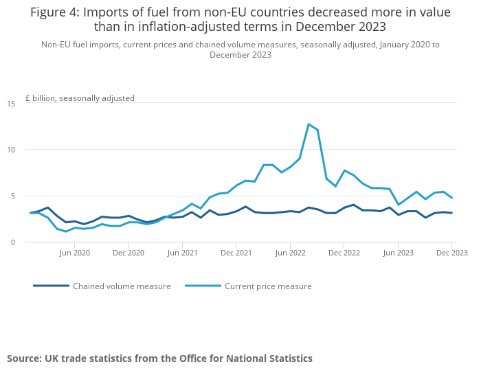 Volatile fuel prices have influenced trends in the value of fuel imports since autumn 2021. The total value of fuel imported from non-EU countries fell by £0.7 billion (12.8%) in December 2023 (Figure 4). In inflation-adjusted terms, imports of fuels from non-EU countries fell by a lesser £0.1 billion (2.6%).