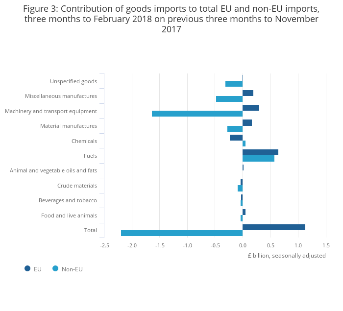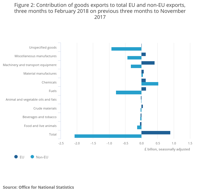 Movements in goods exports were largely offset by imports, therefore there was little change in the goods deficit with EU or non-EU countries, which widened by £0.2 billion and narrowed by £0.1 billion respectively in the three months to February 2018.