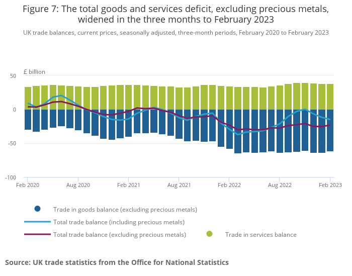 The trade in goods deficit in value terms, excluding precious metals, widened by £0.9 billion to £61.3 billion in the three months to February 2023 and the trade in services surplus narrowed by £1.4 billion to £37.9 billion.