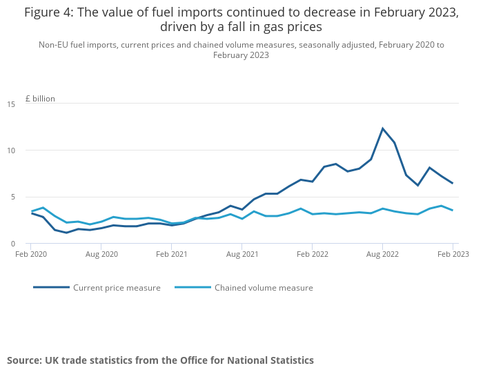 - Fuel imports from non-EU countries reduced in value terms in February 2023, driven by the continued fall in gas prices.