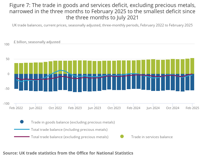 - The total goods and services trade deficit narrowed by £7.5 billion to a deficit of £1.0 billion in the three months to February 2025, the lowest total trade deficit since the three months to July 2021.