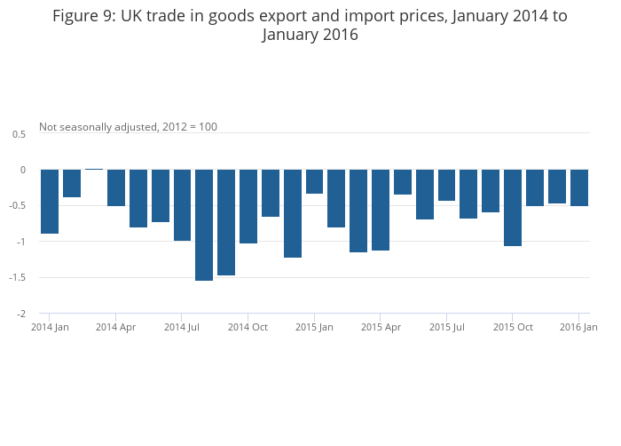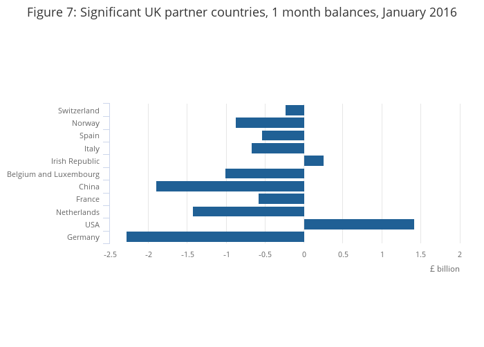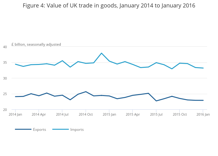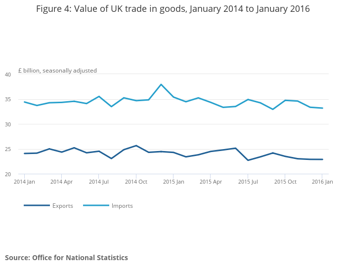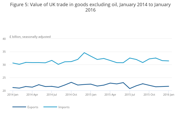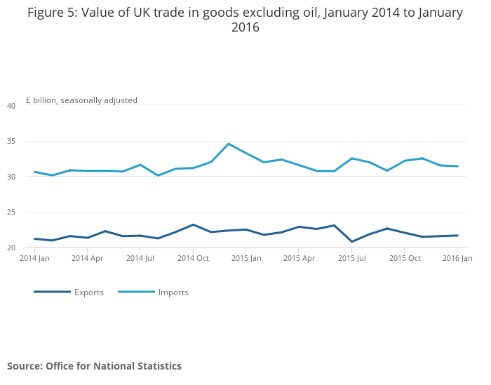 The narrowing of the trade in goods deficit between December 2015 and January 2016 reflected a decrease in imports of £0.2 billion to £33.2 billion attributed to falls in unspecified goods and fuels. However, excluding oil and erratics the trade in goods deficit widened by £0.5 billion between December 2015 and January 2016.
