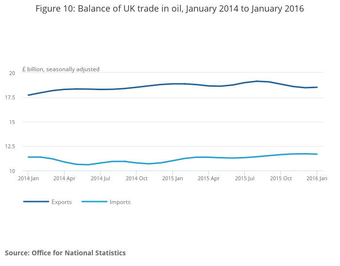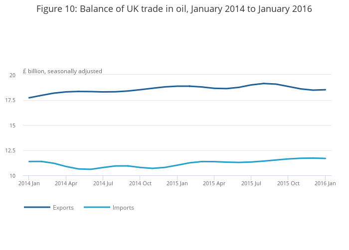 In the 3 months to January 2016, the balance on trade in oil was in deficit by £1.5 billion, narrowing by £0.9 billion when compared with the 3 months to October 2015. Oil exports decreased by £0.4 billion to £4.3 billion and oil imports decreased by £1.3 billion to £5.7 billion.