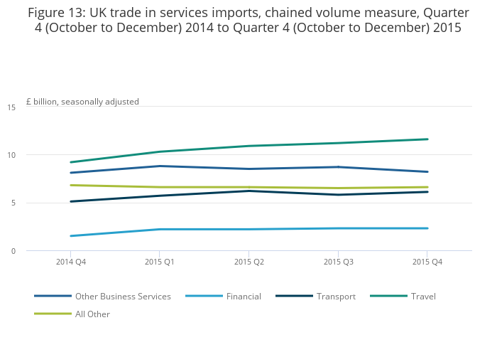 Download this chart Figure 13: UK trade in services imports, chained volume measure, Quarter 4 (October to December) 2014 to Quarter 4 (October to December) 2015