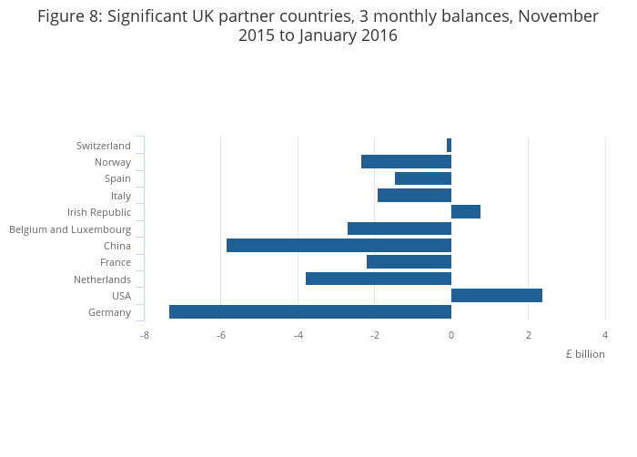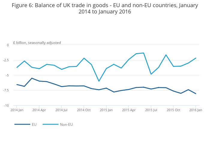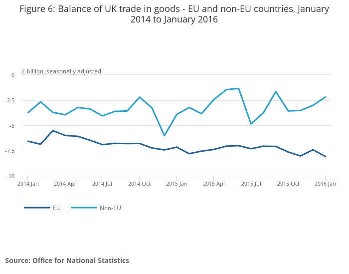 There was a trade in goods deficit with non-EU countries of £8.8 billion in the 3 months to January 2016, narrowing by £0.2 billion from the 3 months to October 2015. Exports of goods to countries outside the EU fell by £1.0 billion, reflecting a £1.1 billion decrease in chemicals. Imports of goods from countries outside the EU fell by £1.2 billion. This decrease was mainly due to a £1.6 billion decrease in fuels; of which, £1.0 billion was oil.