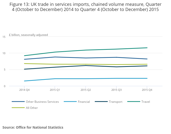 Between Quarter 3 (July to September) 2015 and Quarter 4 (October to December) 2015, exports of services decreased by £0.5 billion to £54.5 billion. The main contributors to the decrease were travel services (£0.3 billion) and other business services (£0.3 billion). For the same period, the import of services increased by £0.3 billion to £34.8 billion, the main contributors to this increase were travel services (£0.4 billion) and transport services (£0.3 billion). These increases were partially offset by a decrease in other business services of £0.5 billion.