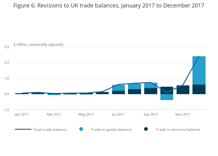 Revisions to the total trade (goods and services) balance are relatively small and upward (narrowing of the deficit) from January 2017 to June 2017, although July 2017 to December 2017 saw larger revisions with the largest upward revision occurring in December (£2.4 billion). This was due primarily to a £2.2 billion downward revision to goods imports alongside a £1.1 billion upward revision to services exports. These revisions were slightly offset by downward goods exports (£0.4 billion) and upward services imports (£0.5 billion) revisions.