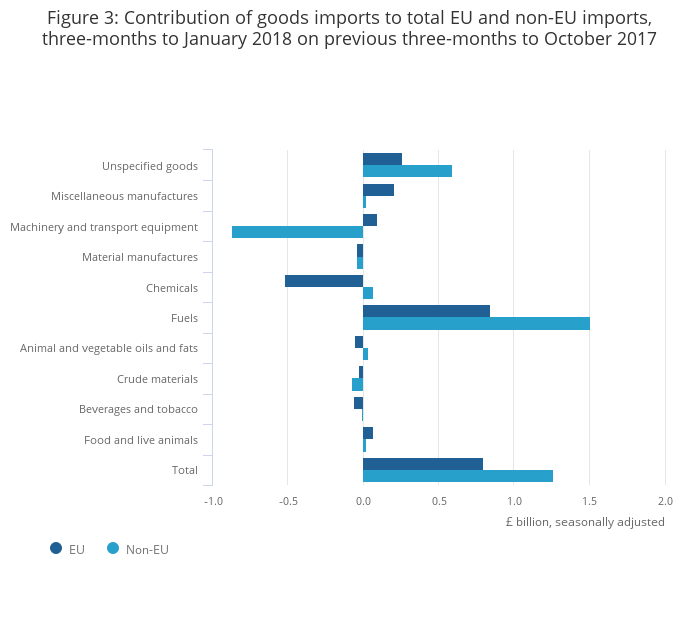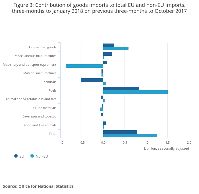 The widening of the trade in goods deficit was due mainly to a £1.3 billion increase in imports (particularly fuels) from non-EU countries, combined with a £1.2 billion decrease in exports (including fuels) to non-EU countries, in the three months to January 2018.