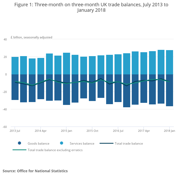 The total UK trade (goods and services) deficit widened by £3.4 billion to £8.7 billion in the three months to January 2018; excluding erratic commodities, the deficit widened by £2.6 billion to £8.9 billion.