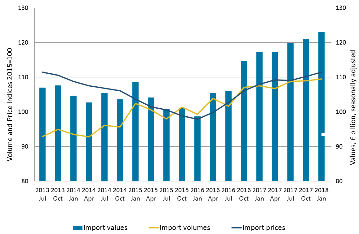 The £2.1 billion increase in the value of total goods imports to £123 billion was due mainly to price increases in the three months to January 2018. Total goods import prices increased by 1.1%, while total goods import volumes rose by 0.5%. The increase in import prices is the second consecutive three-month increase in import prices; this followed a 0.2% decrease in import prices in the three months to July 2017.