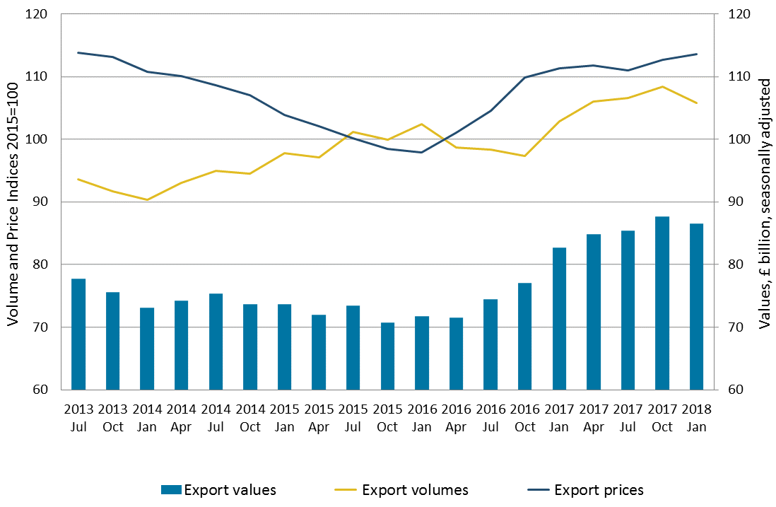 Download this image Figure 4: Three-month on three-month UK goods export values, volumes and prices, July 2013 to January 2018