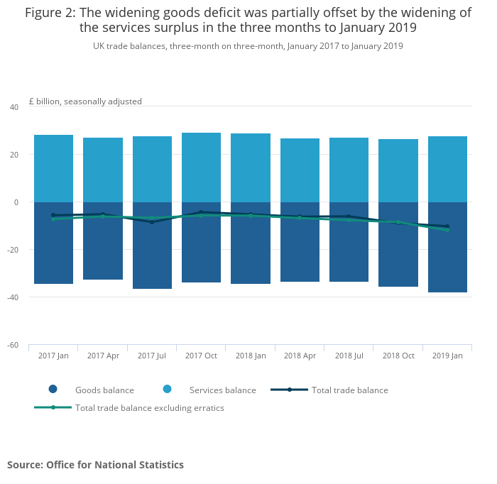 The total trade deficit (goods and services) widened £1.3 billion in the three months to January 2019, as the trade in goods deficit widened £2.4 billion, partially offset by a £1.1 billion widening of the trade in services surplus.
