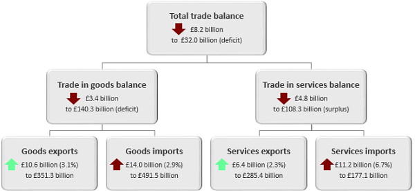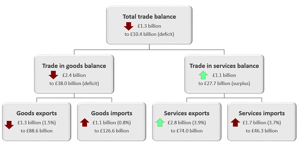 | Trade in goods | Decreased £1.3 billion (1.5%) to £88.6 billion | Increased £1.1 billion (0.8%) to £126.6 billion | Decreased £2.4 billion to £38.0 billion (deficit) |