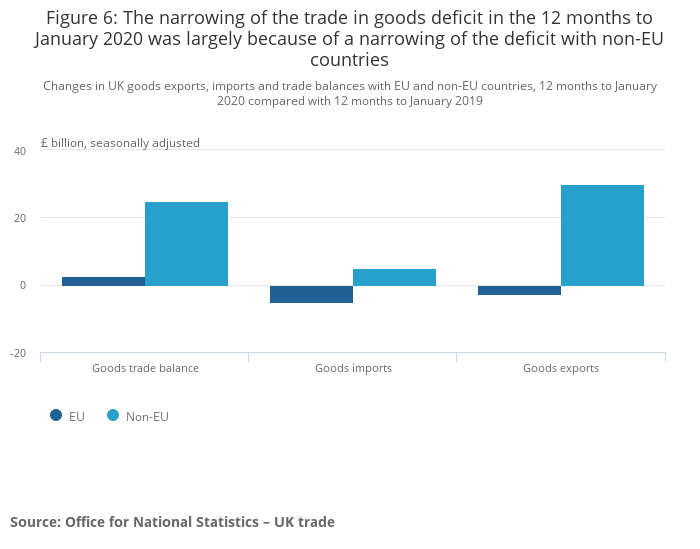 The trade in goods deficit, excluding non-monetary gold and other precious metals, narrowed with both EU and non-EU countries in the three months to January 2020 by £4.4 billion and £1.9 billion respectively.