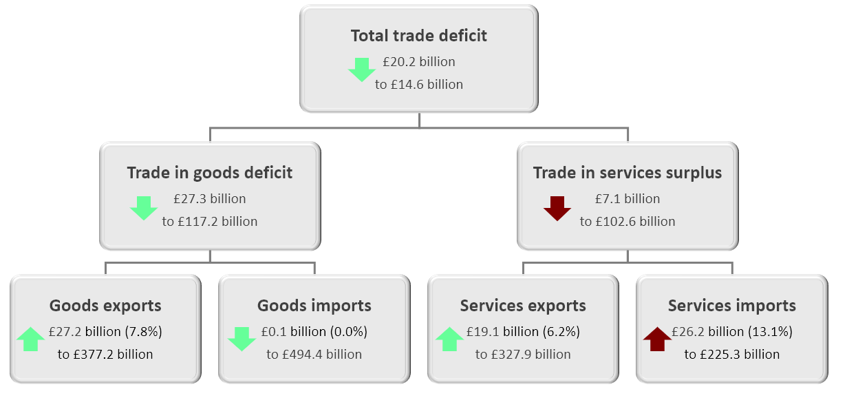 | Trade in goods | Increased £27.2 billion (7.8%) to £377.2 billion | Decreased £0.1 billion (0.0%) to £494.4 billion | Narrowed £27.3 billion to £117.2 billion (deficit) |