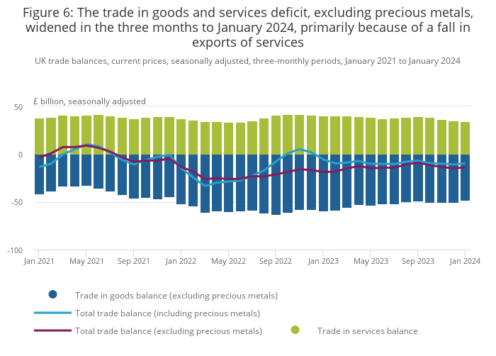 .xls .csvThe total goods and services trade balance, excluding precious metals, widened by £2.2 billion to a deficit of £13.8 billion in the three months to January 2024 (Figure 6). Exports fell by £6.3 billion over this period, and imports fell by £4.0 billion. However, the total goods and services trade balance, excluding precious metals, has remained relatively stable since Quarter 1 (Jan to Mar) 2023. When removing the effect of inflation, the total trade deficit, excluding precious metals, widened by £2.8 billion to £15.2 billion.