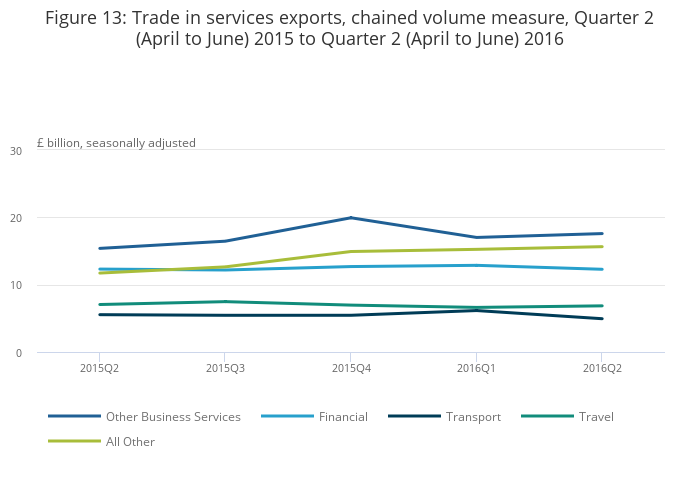 Download this chart Figure 13: Trade in services exports, chained volume measure, Quarter 2 (April to June) 2015 to Quarter 2 (April to June) 2016