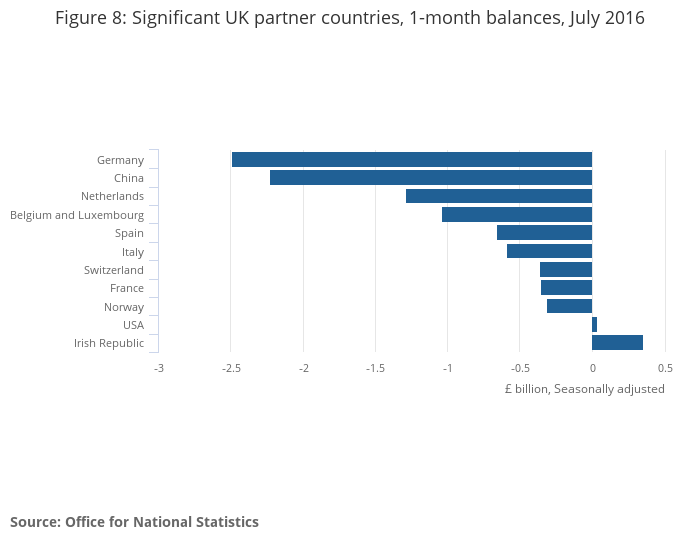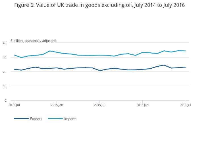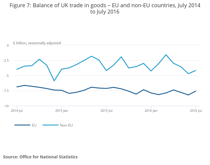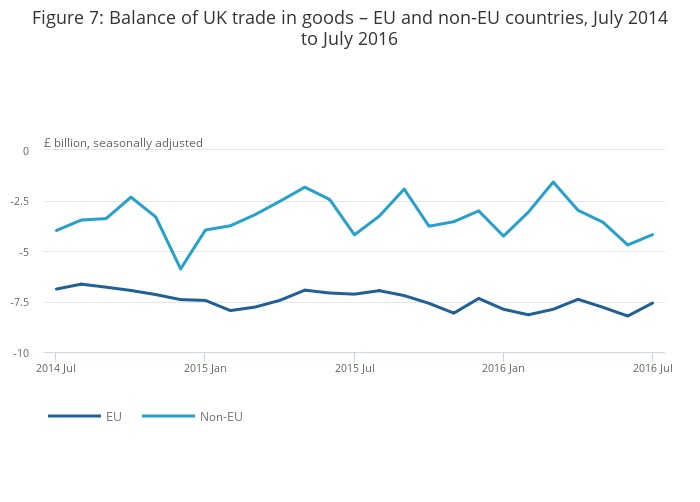 Between the 3 months to April 2016 and the 3 months to July 2016, the UK’s trade in goods deficit with the EU widened by £0.1 billion to £23.6 billion. Between the 3 months to April 2016 and the 3 months to July 2016, the UK’s trade in goods deficit with countries outside the EU widened by £4.8 billion to £12.5 billion, attributed to a decrease in exports (6.8%) and an increase in imports (4.5%).