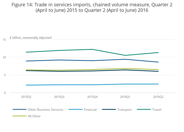 Figure 14: Trade in services imports, chained volume measure, Quarter 2 (April to June) 2015 to Quarter 2 (April to June) 2016