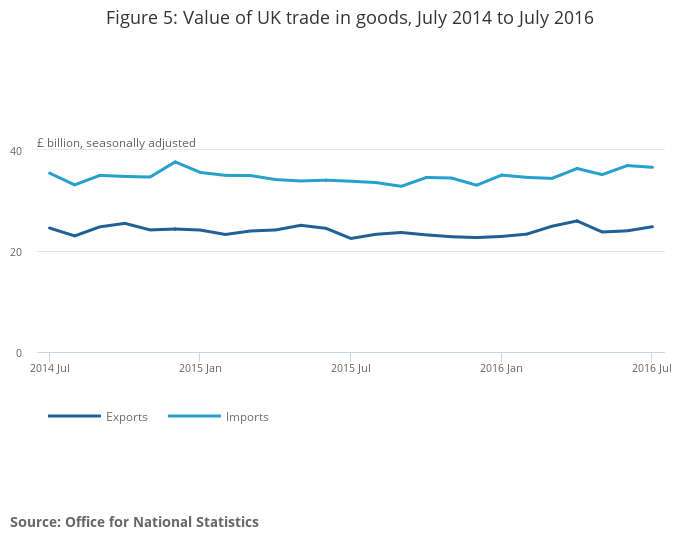 The UK’s deficit on trade in goods and services was estimated to have been £4.5 billion in July 2016, a narrowing of £1.1 billion from June 2016. Exports increased by £0.8 billion and imports decreased by £0.3 billion.