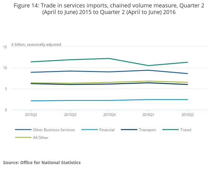 Between Quarter 1 (January to March) 2016 and Quarter 2 (April to June) 2016, exports of services decreased by £0.6 billion to £57.3 billion. The main contributors to this decrease were air transport services (£0.7 billion), financial services (£0.6 billion) and manufacturing and maintenance services (£0.5 billion). This decrease was offset by increases in other business services (£0.6 billion), personal, cultural and recreational services (£0.3 billion) and government services (£0.3 billion). For the same period, imports of services decreased by £0.7 billion to £34.7 billion. The main contributors to this decrease were other business services (£0.9 billion), postal and courier services (£0.2 billion), intellectual property services (£0.2 billion), sea transport services (£0.2 billion) and construction services (£0.2 billion). This decrease was offset by increases in travel services (£0.8 billion) and telecommunication, computer and information services (£0.2 billion).