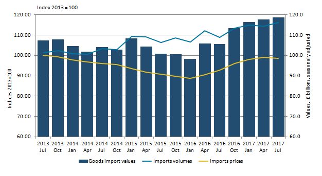 Download this image Figure 5: Rolling 3 month, UK goods imports values, volumes and prices, July 2013 to July 2017