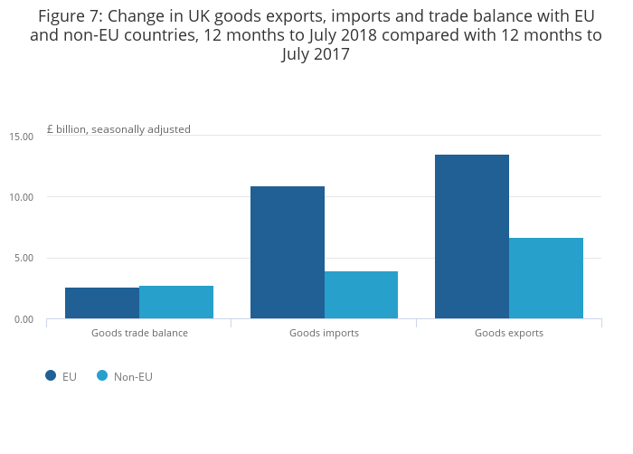 - Goods exports and imports increased by more with the EU compared with non-EU countries in the 12 months to July 2018