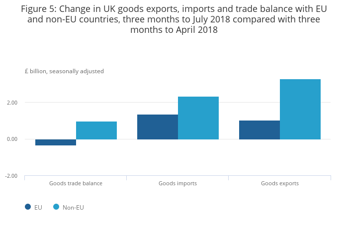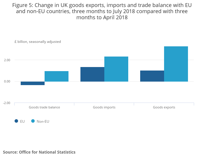 The widening of the trade in goods deficit with the EU was due to a larger increase in goods imports compared with goods exports in the three months to July 2018; imports increased £1.4 billion, while exports rose by £1.0 billion.