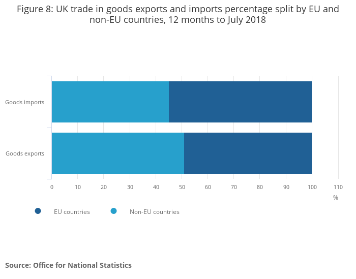 Image .csv .xlsFigure 8 shows the percentage split of goods exports and imports by countries inside and outside of the EU in the 12 months to July 2018.