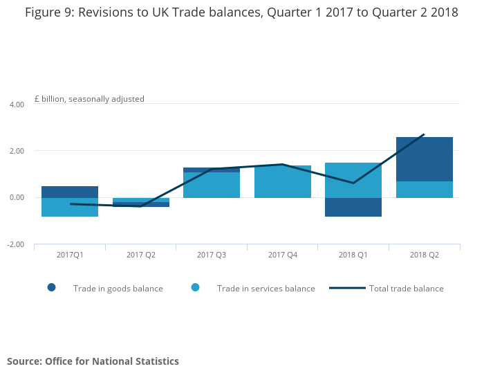 Revisions to the total trade balance ranged from an upward revision of £2.7 billion in Quarter 2 (Apr to June) 2018 to a downward revision of £0.4 billion in Quarter 2 (Apr to June) 2017.