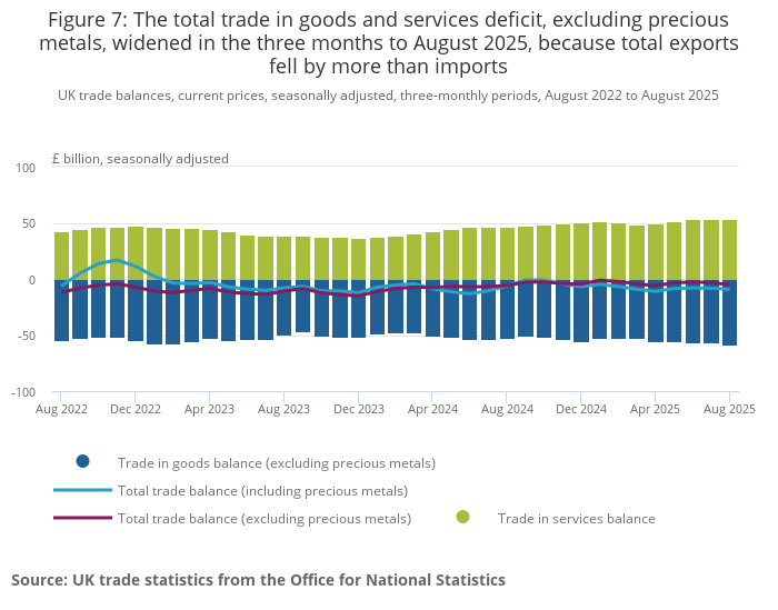The trade in goods deficit in value terms, excluding precious metals, widened by £3.0 billion to £58.4 billion in the three months to August 2025, because goods exports decreased by more than imports. The trade in services surplus is estimated to have narrowed by around £1.3 billion to £53.2 billion, as exports of services increased more than imports.