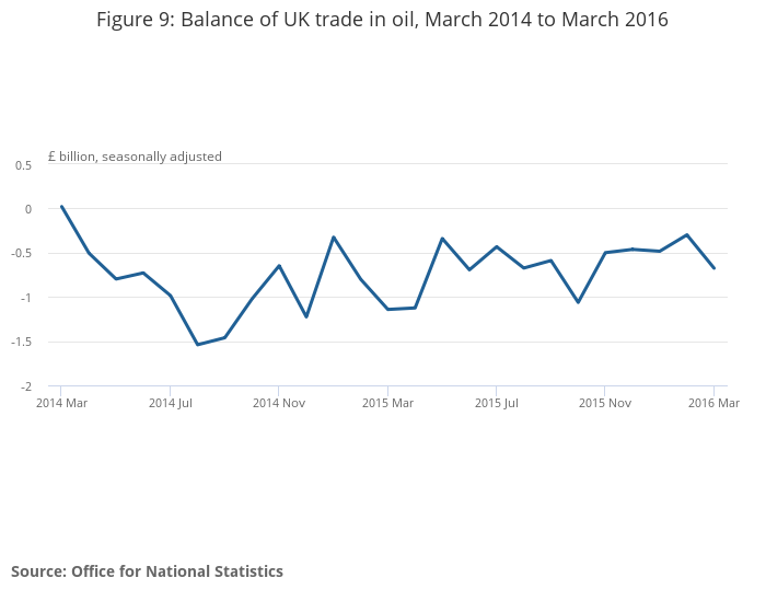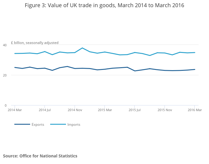 The deficit on trade in goods was £11.2 billion in March 2016; narrowing by £0.2 billion from February 2016. This narrowing reflected an increase in exports (up £0.4 billion to £23.7 billion) and an increase in imports (up £0.2 billion to £34.9 billion). The increase in exports was mainly attributed to a £0.6 billion increase in unspecified goods* and £0.2 billion increase in exports of aircraft; these increases were offset by a £0.5 billion fall in chemicals. The increase in imports was attributed to a £0.4 billion increase in oil and a £0.2 billion increase in aircraft; these increases were offset by a £0.3 billion fall in chemicals.