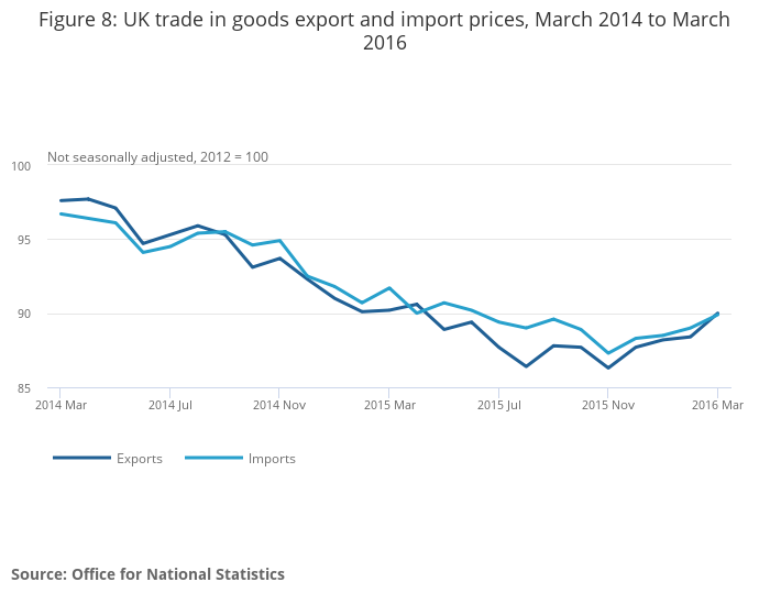 ONS would like to make users aware of an inconsistency between the implied deflator and the underlying price indices in trade in goods for some low level commodities in 2014. It has been estimated that the annual growth in exports and imports of total goods and services should be 0.5 percentage points higher, equivalent to a widening of the trade deficit of approximately £0.5 billion; all else being equal. ONS will correct this at the earliest opportunity in the Quarterly National Accounts publication on 30th June 2016.